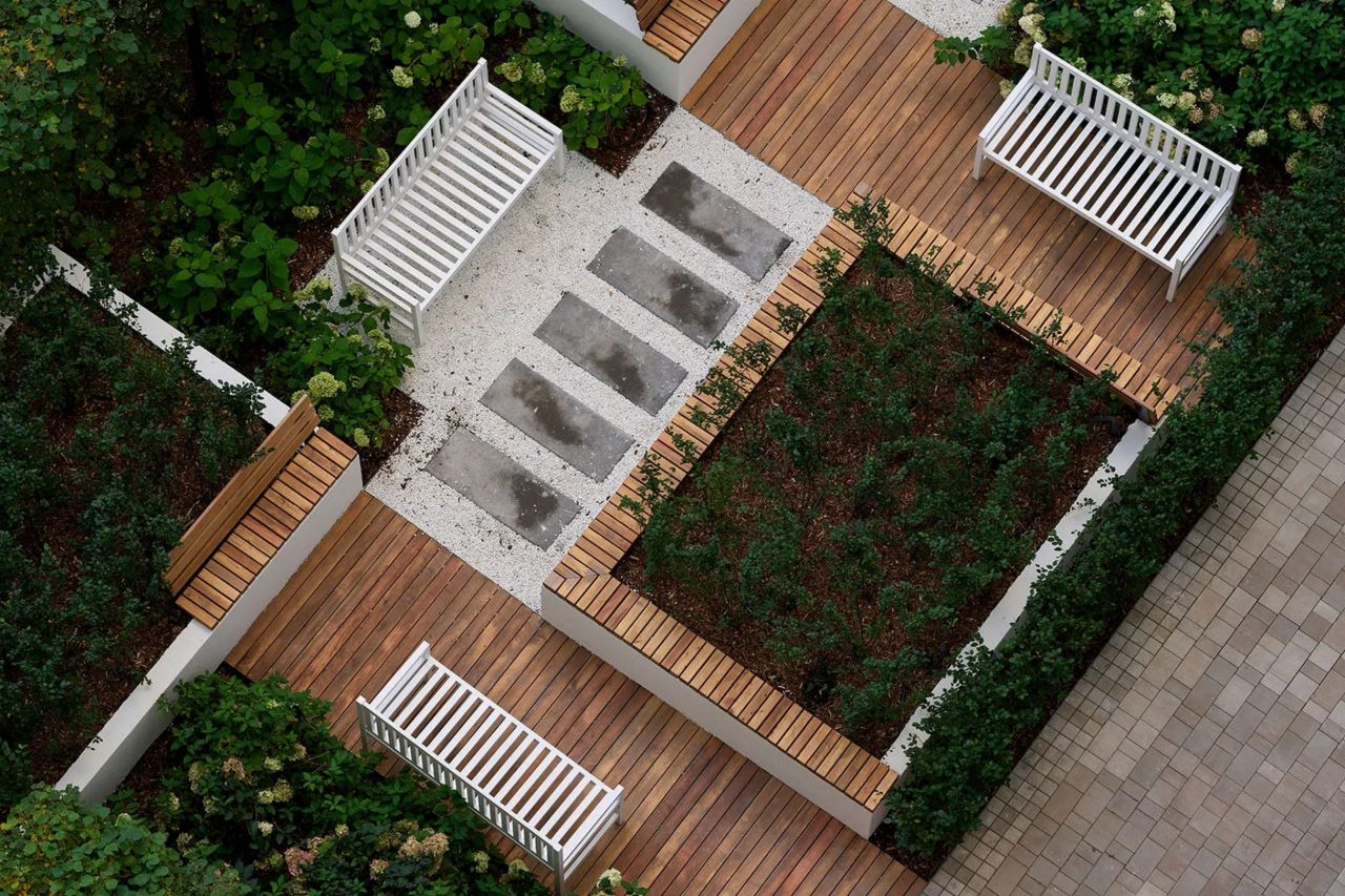 К площадкам примыкает белая беседка-пергола для отдыха. Здесь же размещены патио с деревянными настилами и уличной мебелью. Они окружены живыми изгородями для создания приватности. В южной части двора организовано пространство для тихого отдыха в окружении зелени.
