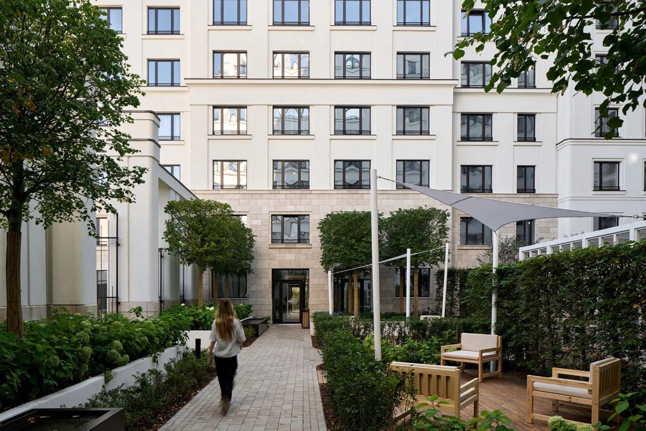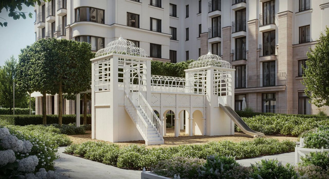 Вход во двор организован через колоннаду. Планировочно он разделён на две части. Парадный партер с большим количеством стриженых растений, фонтанами, цветущими кустарниками и более «домашняя», уютная зона, где высажены деревья с природной формой кроны, низкорослые хвойные растения, многолетники. В центре двора — две детские площадки. Одна предназначена для игр малышей, вторая представляет собой полосу препятствий с геопластикой и травяным покрытием.